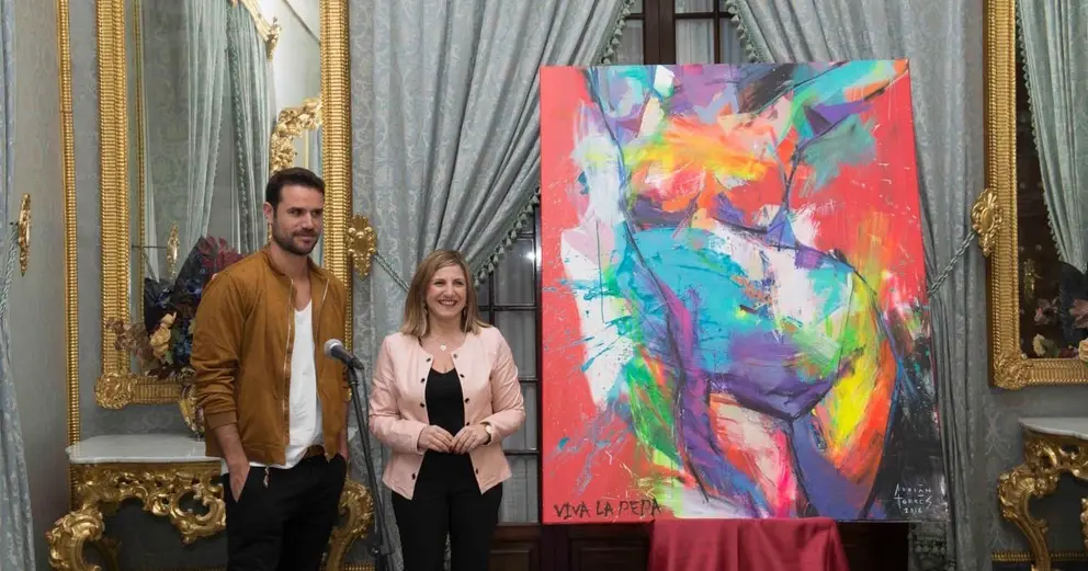 La presidenta de la Diputación, Irene García, y el pintor Adrián Torres (Jerez, 1982) han presentado el cuadro que refleja la imagen del Día de la Provincia 2018, que se celebrará el próximo día 19 y que conmemorará en esta ocasión los 40 años de la Constitución, mantenida con el esfuerzo cotidiano de muchas personas anónimas al mando de sus respectivas labores, profesiones y proyectos personales.