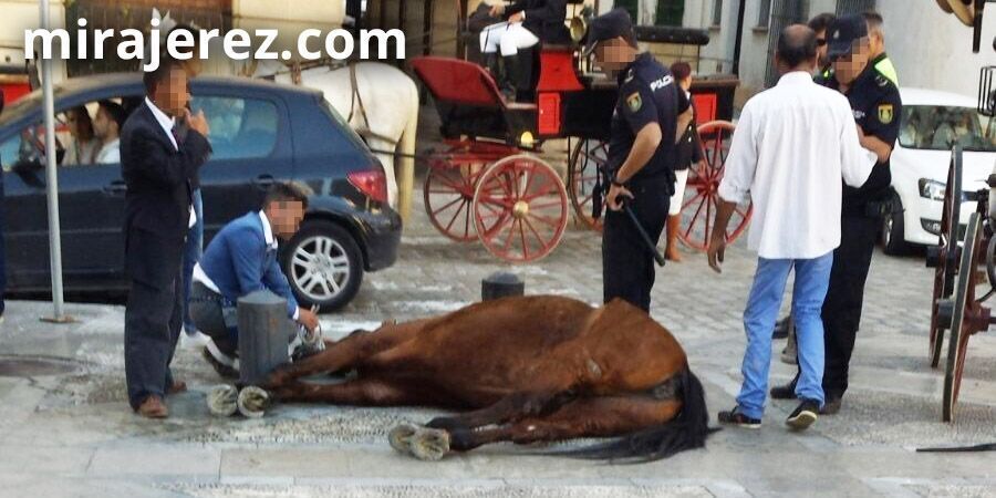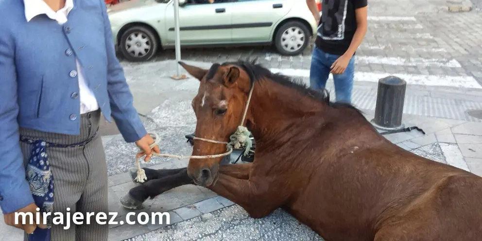 Caballo cae rendido de vuelta a casa tras varias horas en la Feria de Jerez, en 2017