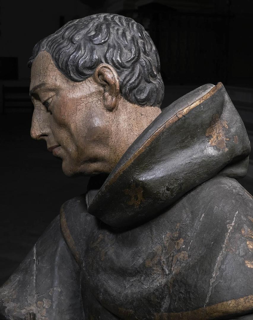 Analizando la cabeza, el gesto de introspección y humildad de los relieves del Bautismo ya se encuentra en el San Diego, el cual remite más directamente a las Inmaculadas realizadas por Montañés en la década de los veinte del XVII y a la Santa Ana de la Iglesia del Buen Suceso (1632-1633). El rehundimiento del entrecejo y el fruncimiento de la frente se repiten en el San Francisco de Santa Clara y en otras obras montañesinas, algunas tan tardías como el San Pascual Bailón de Medina Sidonia (1636). También hay proximidad con las otras representaciones de San Diego del maestro para Ayamonte y Sevilla, observable en los angulosos perfiles del rostro, con pómulos marcados y mejillas hundidas (la de Ayamonte incluso comparte modelado de las orejas) y en el escaso volumen del cabello, peinado hacia delante mediante un dibujo ondeante de gran proximidad, disposición igualmente similar al santo de Medina.