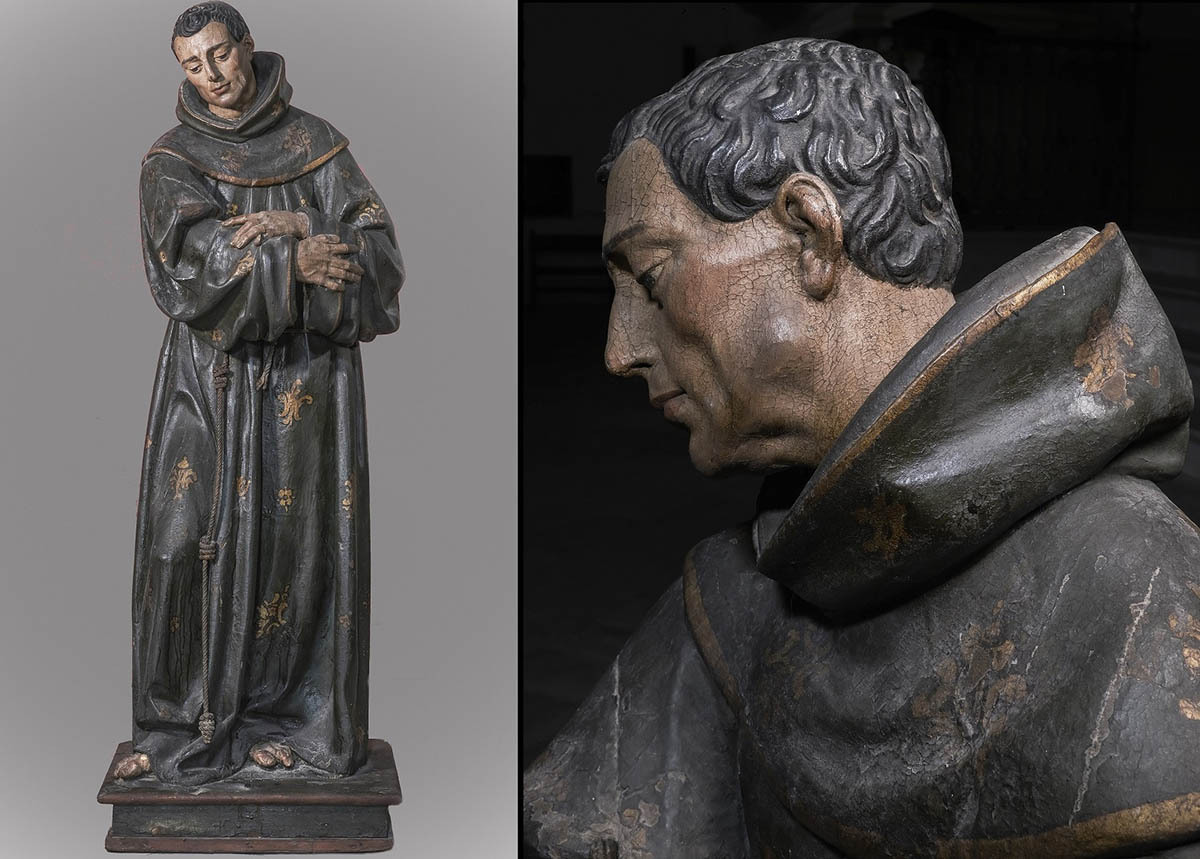 La escultura, de 1,62 m. de altura, representa al santo, con hábito franciscano, de pie. La pierna derecha se adelanta, con la gruesa tela dejando entrever su anatomía, y la izquierda queda retrasada creando una oquedad que no termina de ocultar el volumen y la disposición de esta pierna; el hábito cae holgadamente sobre los pies y la peana. El santo abraza una cruz, hoy perdida, con actitud de recogimiento e introspección, acentuada con la mirada baja y la inclinación de la cabeza hacia delante y hacia su derecha.