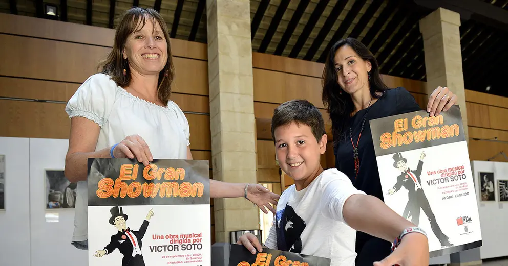 La teniente de alcaldesa de Empleo, Recursos Humanos y Deportes, Laura Álvarez, junto al niño, Víctor Soto y su madre, Eva Alloza, ha presentado el cartel del espectáculo, 'El Gran Showman', una versión de la película musical de Michael Gracey, escrita, dirigida y protagonizada por Víctor, que sólo tiene 10 años. Este montaje se pondrá en escena el próximo viernes, día 28, a partir de las 20 horas, en la Sala Paúl.