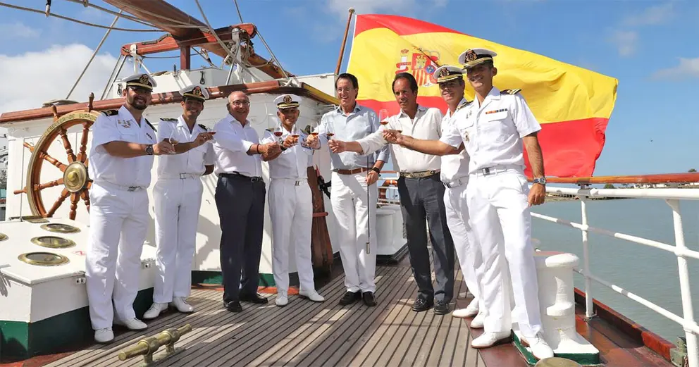 Tras más de cinco meses de navegación en viaje “redondo” a bordo del Buque Escuela de la Armada, XC Palo Cortado “de ida y vuelta” ha llegado al Puerto de Cádiz. Le ha dado la bienvenida Mauricio González-Gordon, presidente de González Byass, que ha recibido de manos del Comandante Capitán de Navío Elcano, Ignacio Paz García, el Manifiesto de Cargo firmado.