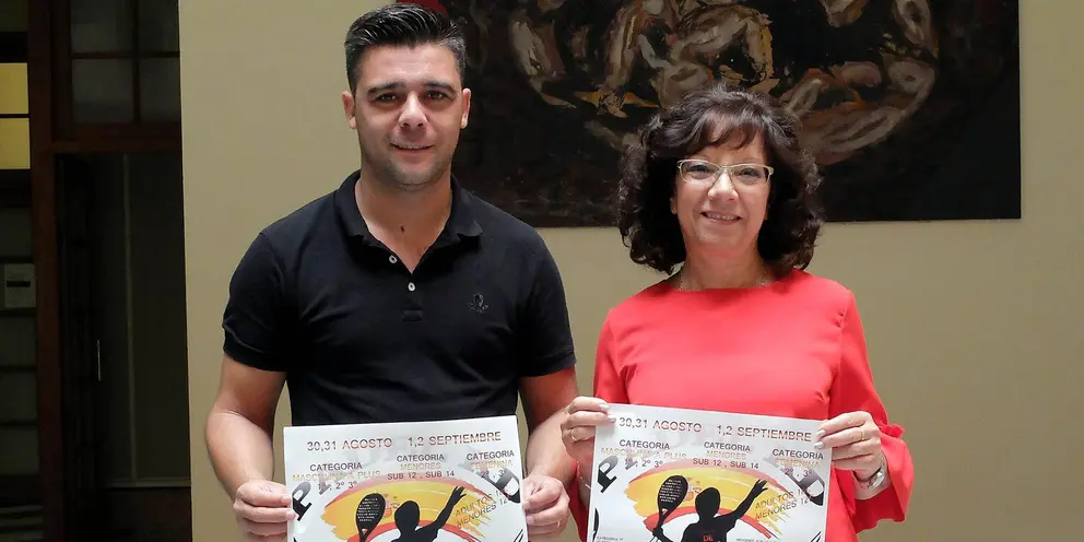 La teniente de alcaldesa, Carmen Collado, junto con el presidente del Club de Pádel KD, Enrique Sastre, ha presentado el cartel anunciador del Torneo de Pádel KD Jerez, organizado por esta entidad en colaboración con el Ayuntamiento, y que se celebrará los días 30 y 31 de agosto, y 1 y 2 de septiembre en las instalaciones del citado Club.