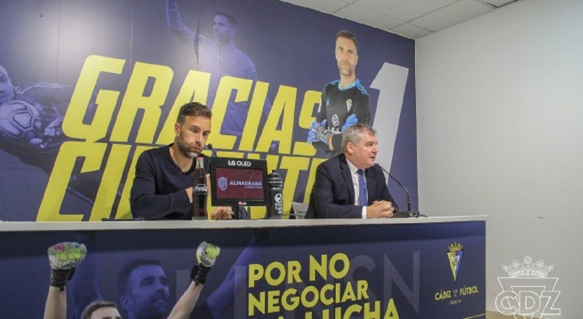La sala de prensa de la Ciudad Deportiva del Cádiz ha acogido una rueda de prensa telemática de despedida como futbolista de Alberto Cifuentes. El guardameta colgaba sus guantes y, en una emotiva comparecencia, se despidió de su etapa como jugador acompañado por el presidente de la entidad, Manuel Vizcaíno.