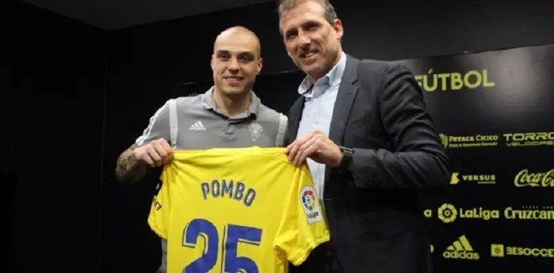 El delantero Jorge Pombo fue presentado en la sala de prensa del Ramón de Carranza como nuevo jugador del Cádiz CF. El ariete, cedido por el Real Zaragoza, fue pronunció sus primeras palabras como cadista ante los medios de comunicación por el director deportivo Óscar Arias.