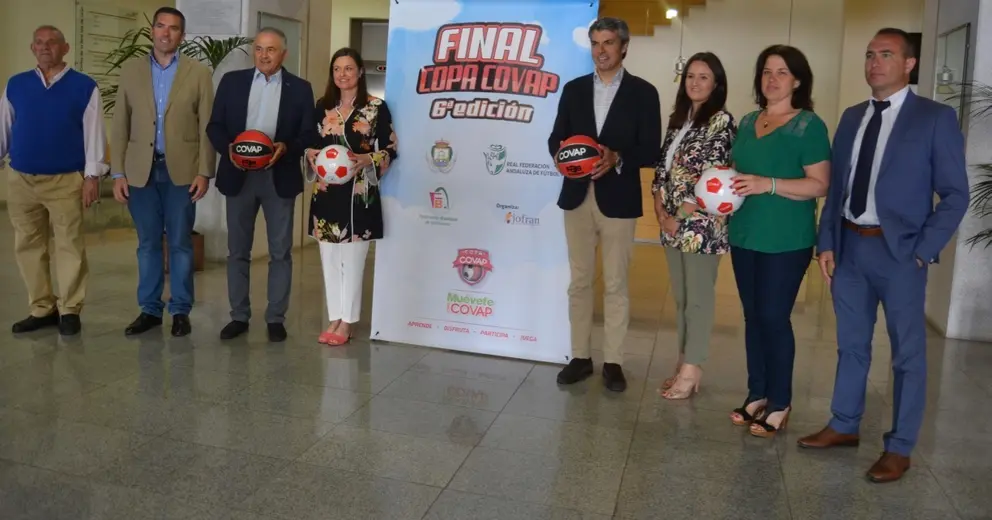 La alcaldesa de la ciudad, Patricia Cavada; el primer teniente de alcaldesa, Fran Romero; la delegada municipal de Deportes, Maite Lebrero; el ex futbolista y padrino de la Copa COVAP, Rafael Gordillo; la responsable de comunicación de COVAP, Sonia García; el director de Jofran Eventos, José María Mora, y representantes de la Federación Andaluza de Baloncesto y de la Real Federación Andaluza de Fútbol han presentado esta mañana en el Centro de Congresos la final de la sexta edición de la Copa COVAP, que tendrá lugar entre los próximos 16 y 17 de junio en la Ciudad Deportiva de Bahía Sur.