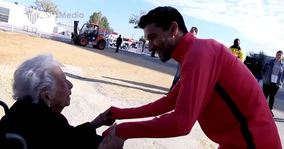 Una sevillista de 102 años se emociona al conocer a Jesús Navas