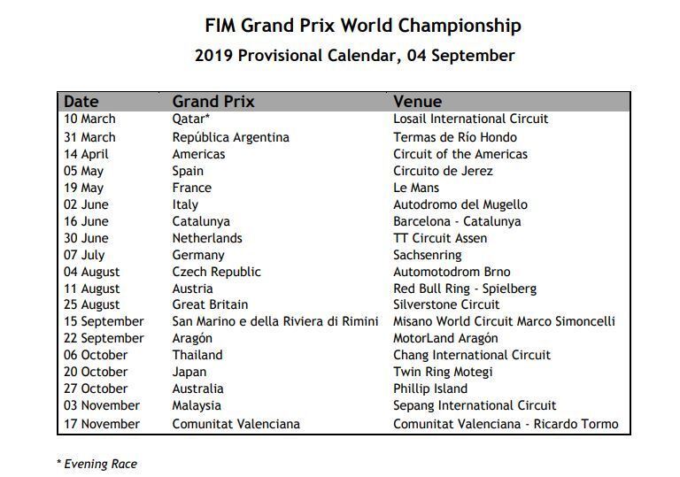 La Federación Internacional de Motociclismo (FIM) ha dado ha conocer en la jornada de este martes el calendario provisional para la próxima temporada. El inicio del campeonato llevará a los pilotos hasta Qatar el 10 de marzo para disputar los primeros puntos de la temporada en la ya tradicional carrera nocturna. Será además la primera oportunidad de ver a Jorge Lorenzo con su nuevo equipo (Repsol Honda) tras su marcha de Ducati.
