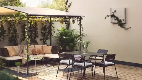 Este set de muebles para terraza y jardín de Ikea destaca por su diseño elegante y minimalista que cuenta con la capacidad de adaptar sus sillones en función del espacio disponible, adaptándose a cualquier tipo de esquina o giro de las zonas exteriores del hogar.