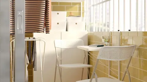 Con un práctico sistema plegable que te permite disponer de él cómodamente cuando no está en uso, está este set de muebles para exterior compuesto por una mesa abatible con medidas equivalentes a 92 x 02 x 74 cm y 4 sillas plegables con 50 x 53 x 83 cm.