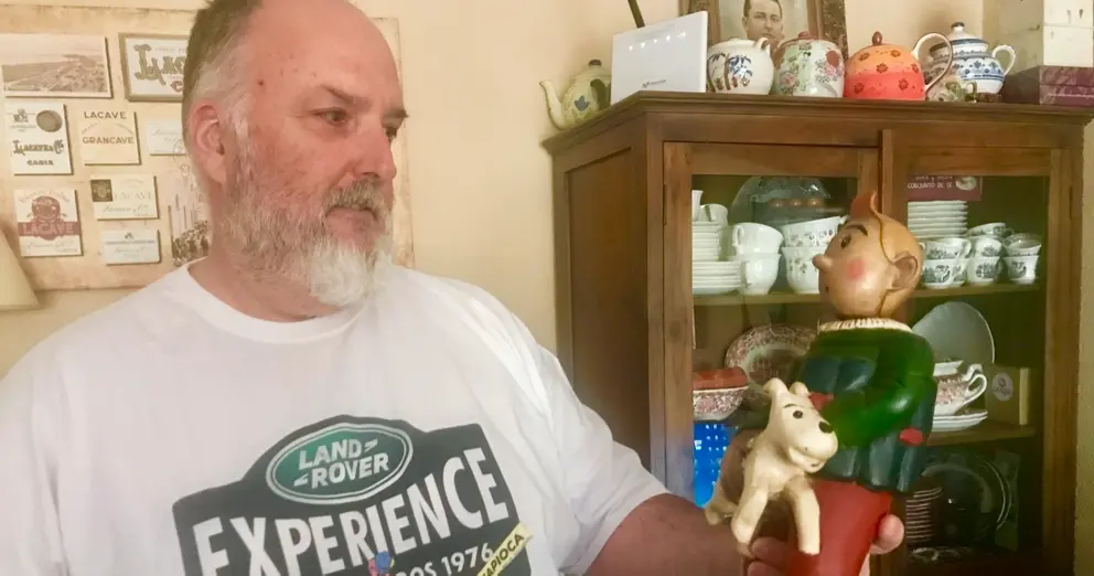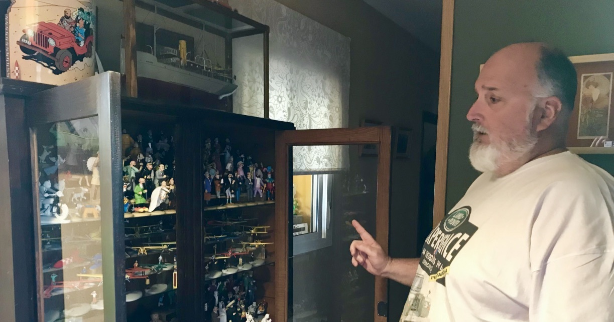 Empecé mi colección hace muchos años. Principalmente papel, libros y revistas. Con el tiempo fue adquiriendo figuras y reproducciones. La parte que de verdad amo es la de papel. Tengo unas 700-800 referencias de libros de Tintin, sobre Tintin y la obra de Hergé. De figuras será como la mitad de eso. Pero el papel es lo importante, la guardo muy cuidadosamente en un contenedor marítimo que dispuse en el jardín de mi cada para tenerla bien conservada en cajas de corcho y archivada de forma museística.