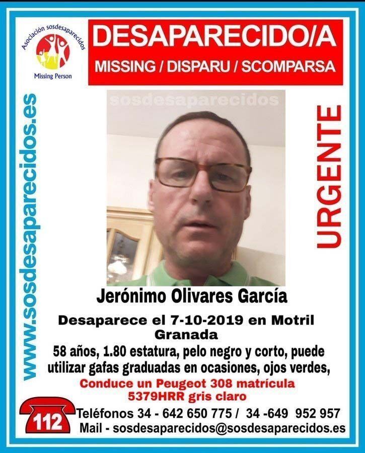 La Asociación SOS Desaparecidos se ha hecho eco de la desaparición de Jerónimo Olivares García, un hombre de 58 años que fue visto por última vez en el término municipal de Motril, en la provincia de Granada.
