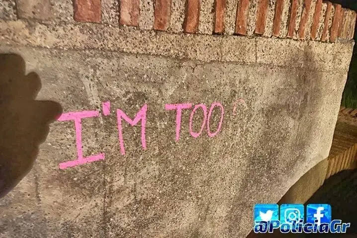 Fue sobre las 20,46 horas del pasado 19 de septiembre cuando desde el control de cámaras de la Sala de 092 se detectó a la joven cometiendo esta infracción. Desde la central de coordinación se dio aviso, informando de lo que estaba ocurriendo, y una unidad se desplazó al lugar. Allí sorprendió a dos jóvenes de 22 y 20 años, siendo la de menor edad la que estaba agachada y realizando la pintada, en la que se puede leer "I'M TOO...".
