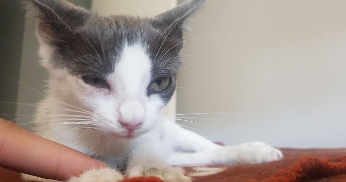 Esta gatita fue encontrada con un párpado casi cerrado debido a la irritación y mocos que dificultan su respiración. Además, su estado físico es muy débil, ya que se encuentra muy por debajo de su peso.