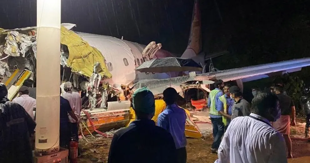 Imágenes transmitidas por la cadena NDTV muestran la aeronave, que procedía de Dubái, partida por la mitad en la pista de aterrizaje, que presenta escombros.