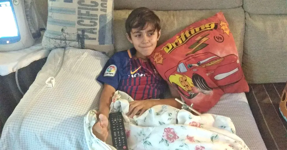 Aitor, de 9 años de edad, ha salido en la tarde del viernes del Hospital Puerta del Mar de Cádiz tras casi dos meses ingresado en el mismo, encontrándose ya en casa, como se puede ver en la imagen, sentado en el sofá del salón y en posesión del mando a distancia.