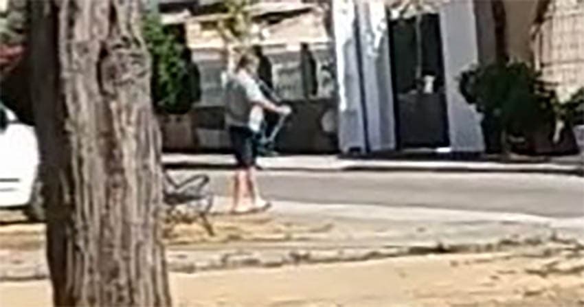 Supuesto tío paterno del joven agredido amedrentándolo con un cable para evitar quee accediera a su vivienda