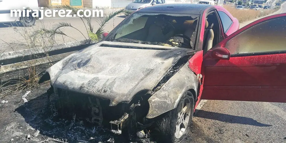 La conductora de un turismo de la marca Mercedes se ha llevado un enorme susto al producirse supuestamente un cortocircuito en su vehículo, que tras incendiarse ha dejado el vehículo totalmente calcinado. Tras ver el humo, la conductora se echó a un lado comenzando a ser visibles las llamas.