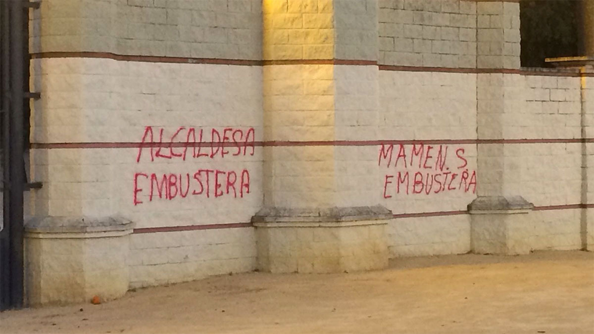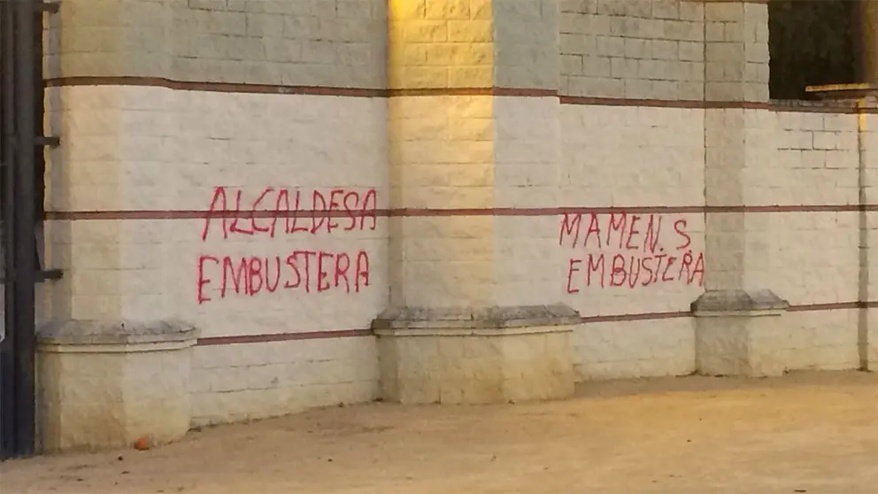 Los textos con spray contienen los mensajes: "Alcaldesa Embustera", "Mamen Sánchez embustera" y "PSOE vete ya"