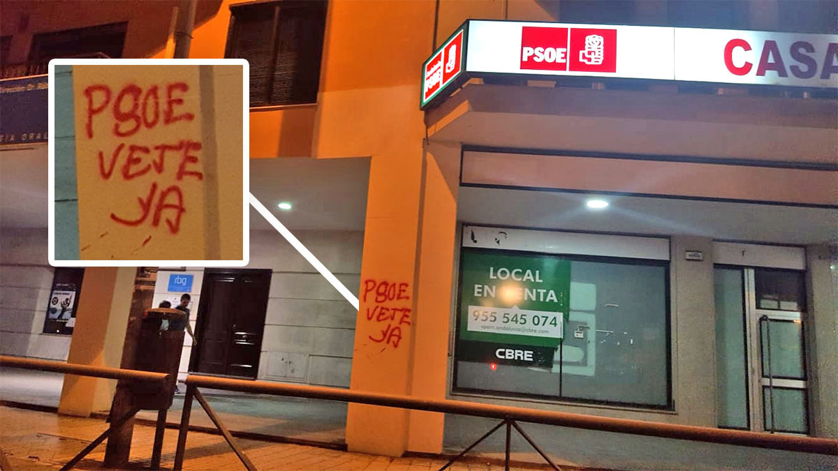 La fachada del edificio ubicado en la calle Sevilla, frente a la Plaza del Mamelón, donde se encuentra la sede del PSOE en Jerez también ha sufrido pintadas durante la noche, en este caso con la referencia "PSOE vete ya".