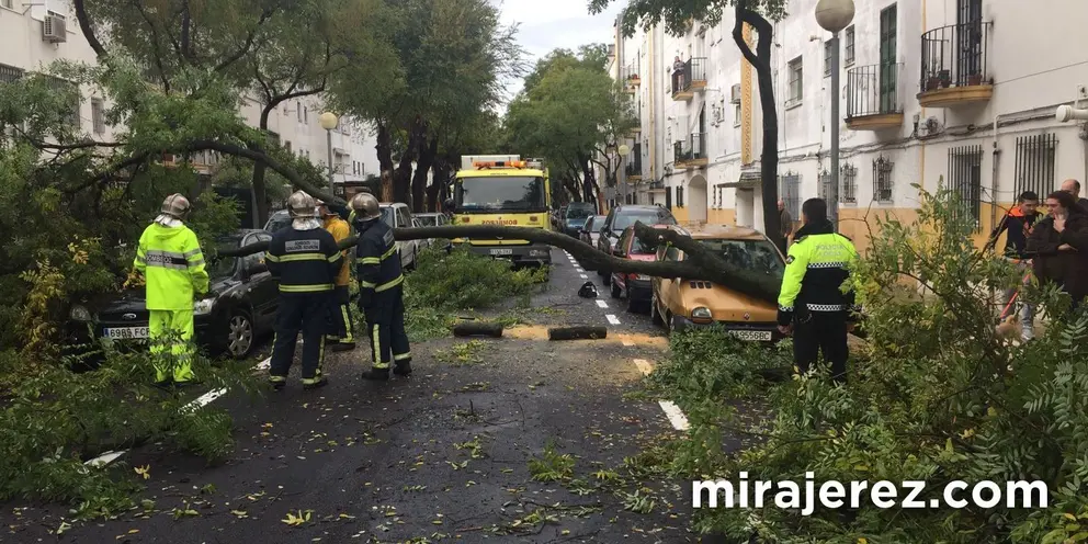 El temporal que está azotando Jerez ha provocado que el árbol de grandes dimensiones se terminara desplomando