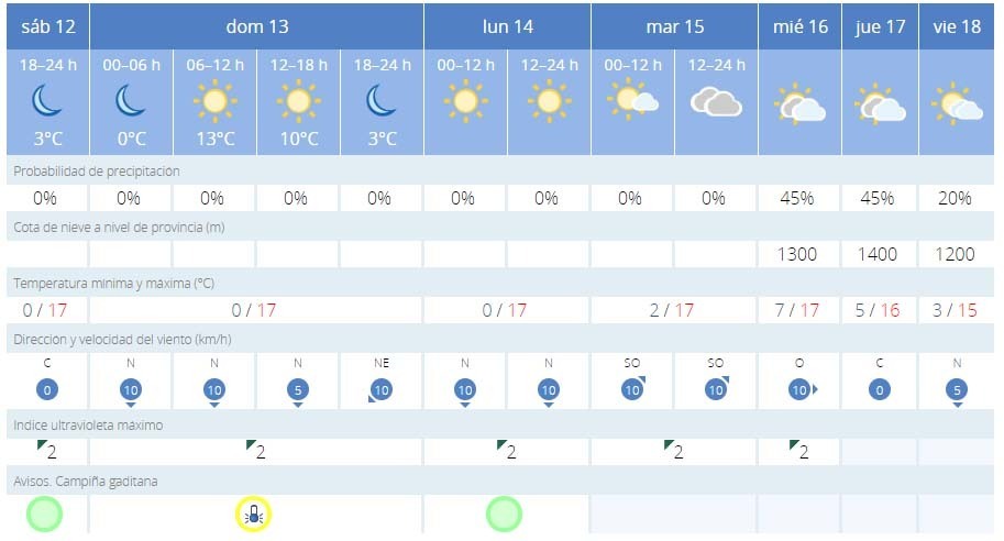 Las mínimas serán constantes y muy similares a las de los últimos días, con temperaturas que bajarán de los 0 grados centígrados. A partir del miércoles las mínimas irán en aumento, alcanzando los 7 grados.
