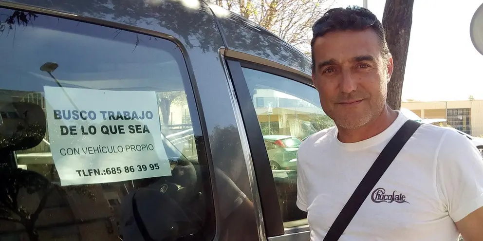Se llama Jesús Merino. 44 años. Padre de familia, con dos hijos de 17 y 11 años. Y busca trabajo "de lo que sea". Tanto es así, tal es su necesidad y deseo de llevar a fin de mes un dinero a su casa, que este jerezano ha dejado de lado la timidez y, muy decidido, ha pegado en las ventanillas de su coche un anuncio que dice así: "Busco trabajo de lo que sea. Con vehículo propio. Teléfono: 685 863 995".