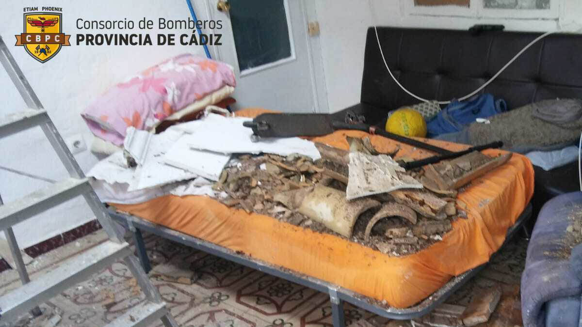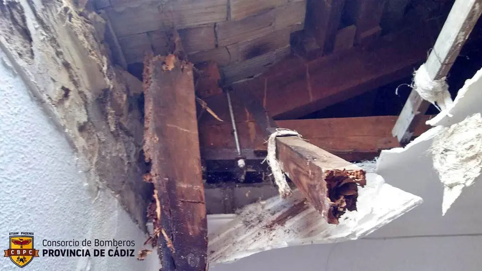 Salvados por no encontrarse justo debajo del techo siniestrado. Los Bomberos del Consorcio Provincial del parque de Jerez de la Frontera han intervenido en la mañana del domingo en la inspección de una vivienda de planta baja. Está situada en la calle Olivo de La Barca, pedanía jerezana.