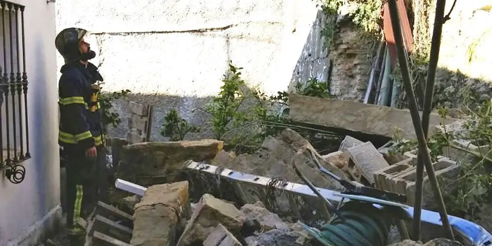 Bomberos del CBPC en el parque de Jerez han intervenido este mediodía en inspeccionar un muro derrumbado sobre el patio de una vivienda en la calle Alguacil, 1 en la barriada rural de Los Albarizones.