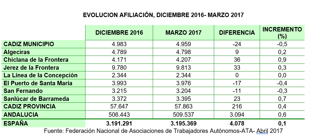 La provincia de Cádiz cierra el primer trimestre del año con un aumento de 216 trabajadores autónomos, lo que supone un crecimiento del +0,4%, pasando de los 57.647 autónomos a 31 de diciembre de 2016 a 57.863 el 31 de marzo de 2017.