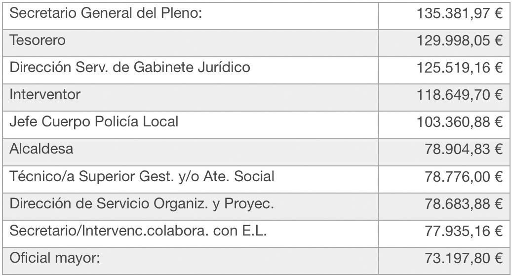 El digital aporta los diez puestos con mayor remuneración, donde cinco acumulan salarios que están por encima de 100.000 euros y tres, por encima de 125.000 euros, a pesar de que la alcaldesa ha manifestado en la mañana del lunes que "es rotundamente falso que haya funcionarios que cobren retribuciones de 120.000 euros anuales, por cuanto no hay ningún empleado/a municipal que cobre esta retribución, ni tan siquiera cantidad cercana", información de la edil socialista, que a tenor del propio presupuesto que ha elaborado su equipo de gobierno, no sería cierta.