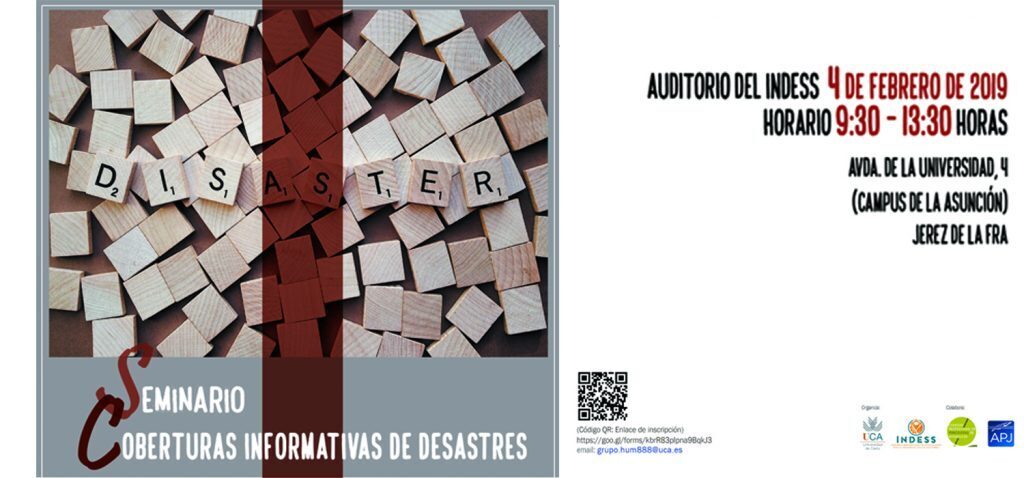 El grupo de investigación PAIDI HUM 888: Salud, Género y Desarrollo celebra junto al Instituto Universitario de Desarrollo Sostenible (INDESS) de la Universidad de Cádiz el próximo lunes 4, a partir de las 9,30 horas y en la sede del INDESS en el Campus de Jerez, el Seminario Cobertura Informativa de Desastres, con la colaboración de la Asociación de la Prensa de Jerez y del Colegio Profesional de Periodistas de Andalucía en Jerez.