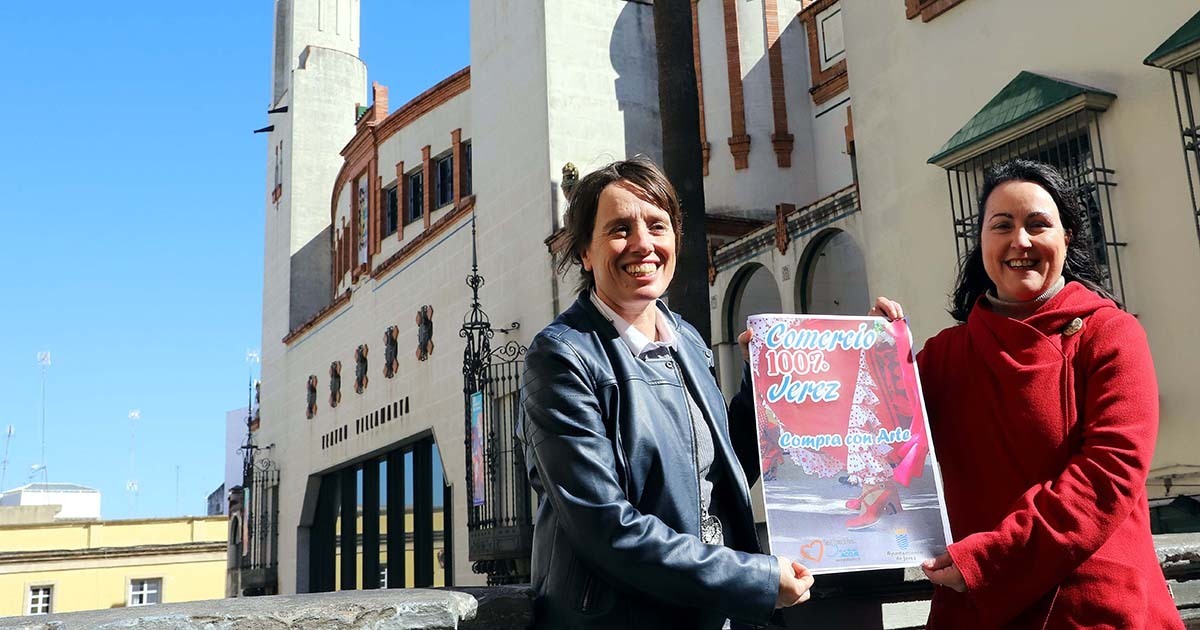 La teniente de alcaldesa de Empleo, Recursos Humanos y Deportes, Laura Álvarez, junto a la presidenta de la Asociación de Comerciantes del Centro (Acoje), Nela García, han presentado el cartel de la campaña Comercio 100% Jerez. Compra con arte, que se desarrollará en el Centro Comercial Abierto de Jerez, coincidiendo con el XXIII Festival de Jerez, entre los días 22 de febrero y 9 de marzo.