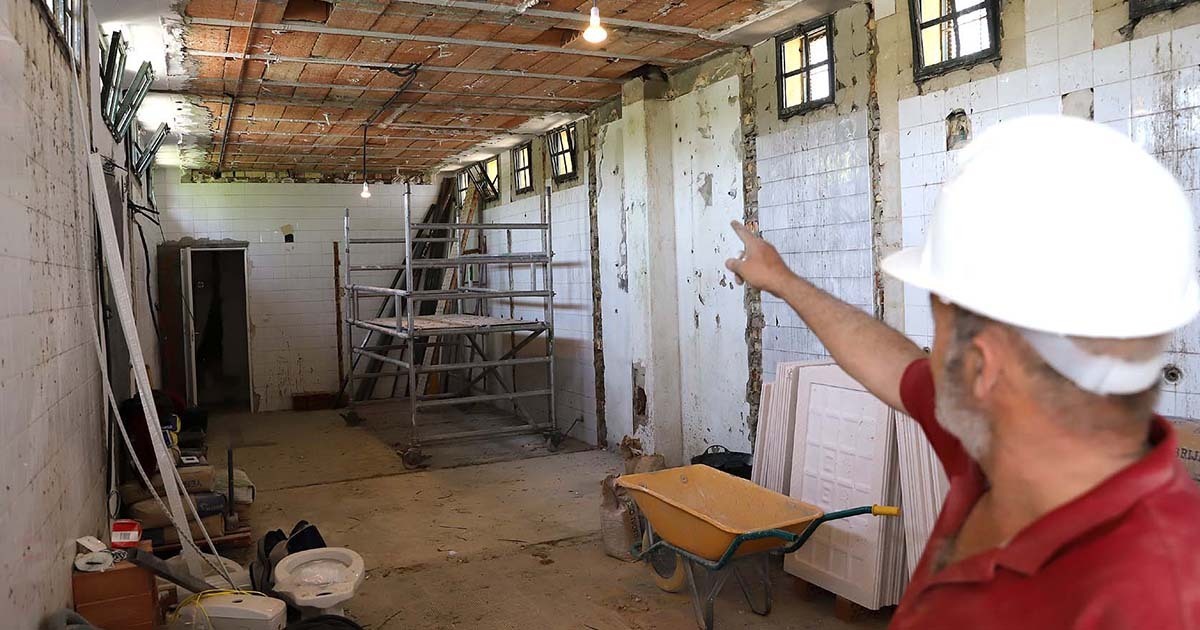 De esta manera, se han demolido techos y tabiques así como se ha procedido a la limpieza integral de la cubierta. Se están realizando tareas de ‘enfoscado’, instalación de falsos techos de escayola y alicatado de las paredes que así lo precisan de vestuarios.