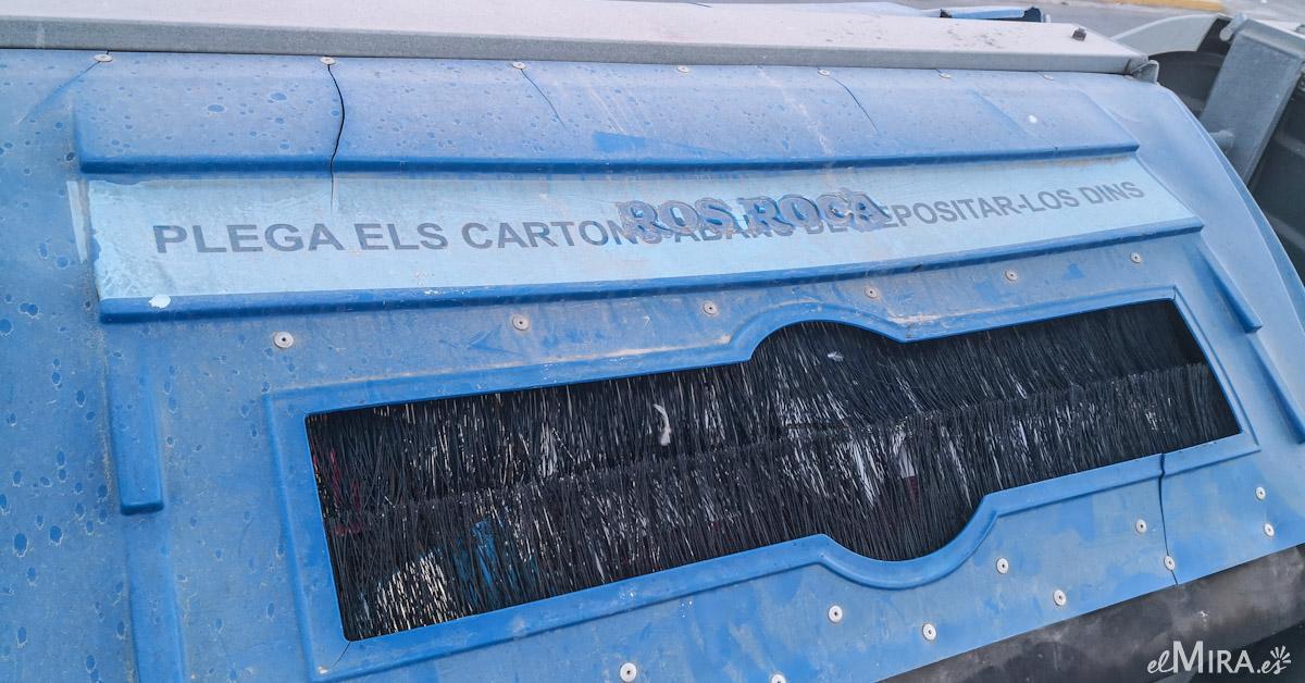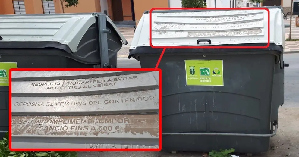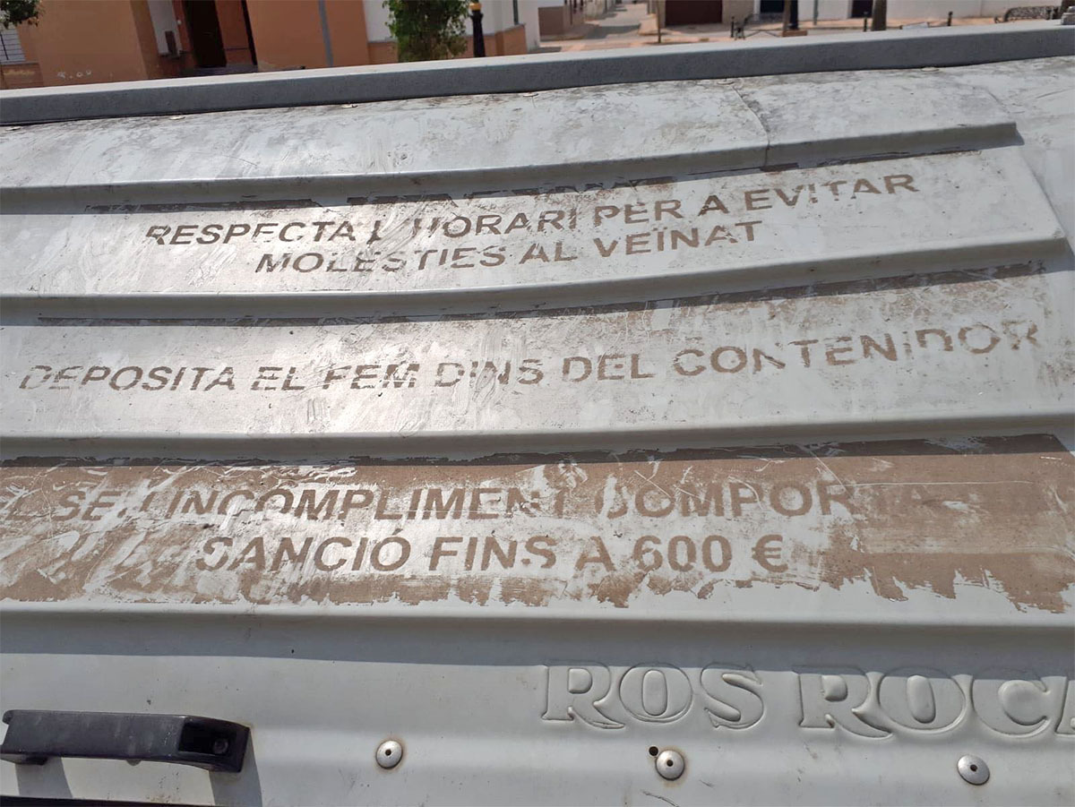 “RESPECTA L'HORARI PER A EVITAR MOLESTIES AL VEINAT” (Respeta el horario para evitar molestias al vecindario”, “DIPOSITA EL FEM DINS DEL CONTENIDOR” (Deposita la basura dentro del contenedor) o “EL SE INCOMPLIMENT COMPORTA SANCIÓ FINS A 600€” (El incumplimiento comporta una sanción de hasta 600 €), son las inscripciones en catalán que se pueden leer en el contenedor de Nueva Jarilla, que es el mismo que el colocado en el resto de la zona rural.