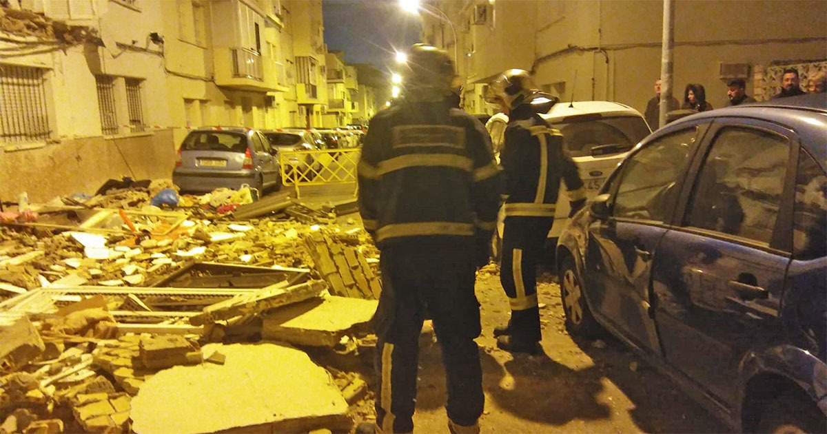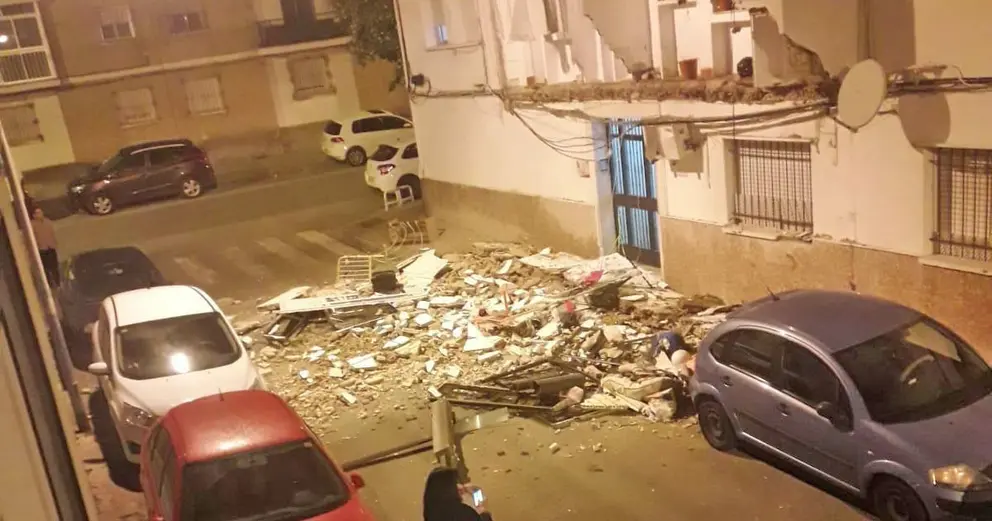 Dos balcones corridos de la primera planta del número 16 de la calle Bulería se han desplomado afectando a cuatro coches que se encontraban en la zona, no produciéndose daños personales, desalojando durante parte de la mañana a los vecinos.