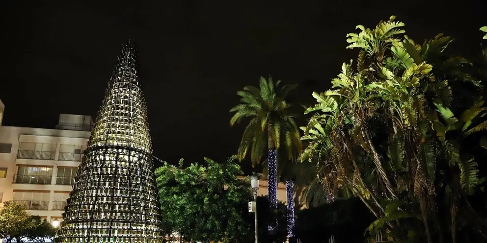 El árbol tiene 10 metros de altura con un tronco cónico formado por botellas de cristal e iluminado con proyectores
