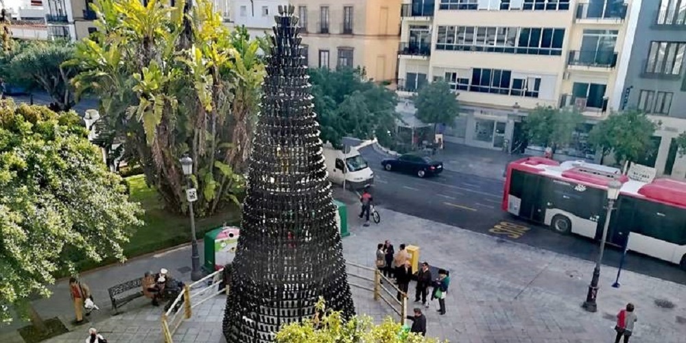 El árbol de Navidad tiene 10 metros de altura con un tronco cónico formado por botellas de cristal e iluminado con proyectores. El árbol lo instala Ecovidrio con la colaboración del Área de Medio Ambiente del Ayuntamiento enmarcado en una campaña de sensibilización con el objetivo de transformar vidrio por juguetes para la Asociación de los Reyes Magos.