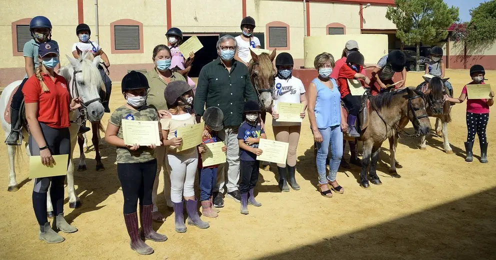 El teniente de alcaldesa de Dinamización Cultural y Patrimonio Histórico, Francisco Camas, y la Delegada de Acción Social y Políticas Inclusivas, Carmen Collado, han entregado hoy sus diplomas a uno de los grupos de menores participantes en la iniciativa ‘Un verano a caballo’, un campamento infantil de iniciación a la hípica organizado en el Centro Ecuestre El Juncal (carretera Jerez-Arcos, Km2) como iniciativa conjunta de esta empresa y el Ayuntamiento, a través de la Unidad Ecuestre de la Tenencia de Alcaldía de Dinamización Cultural y Patrimonio Histórico y la Delegación de Acción Social.