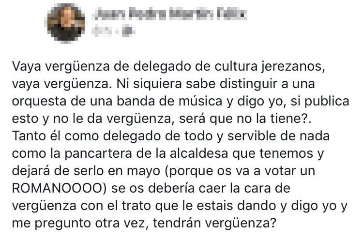 "Este impresentable no distingue a una banda de una orquesta. Menudo delegado de cultura tenemos", manifiesta un ciudadano a elMIRA.es. Francisco Camas, delegado de Cultura del Ayuntamiento de Jerez (PSOE), publicó el domingo a las 13:39 horas en redes sociales: “Domingo de concierto de la Orquesta Municipal Jerez”, tras presenciar presuntamente el concierto de la Banda Municipal. Las diferencias entre una Orquesta y una Banda de Música son evidentes, y así se lo han hecho saber inmediatamente los usuarios de Facebook.
