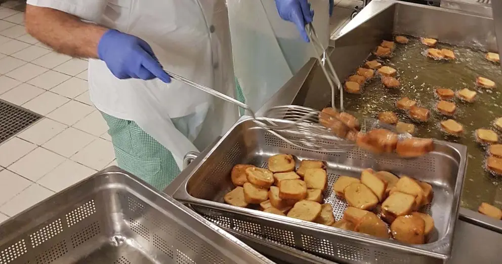 El Hospital de Jerez ha ofrecido a sus pacientes con la merienda torrijas, coincidiendo con el Viernes de Dolores. Para ello, varios cocineros, pinches y el jefe de Cocina prepararán esta noche unas 1.500 de este dulce típico de la Semana Santa para cumplir con una iniciativa que desde hace siete años desarrolla el centro con gran éxito entre personas ingresadas y sus acompañantes.