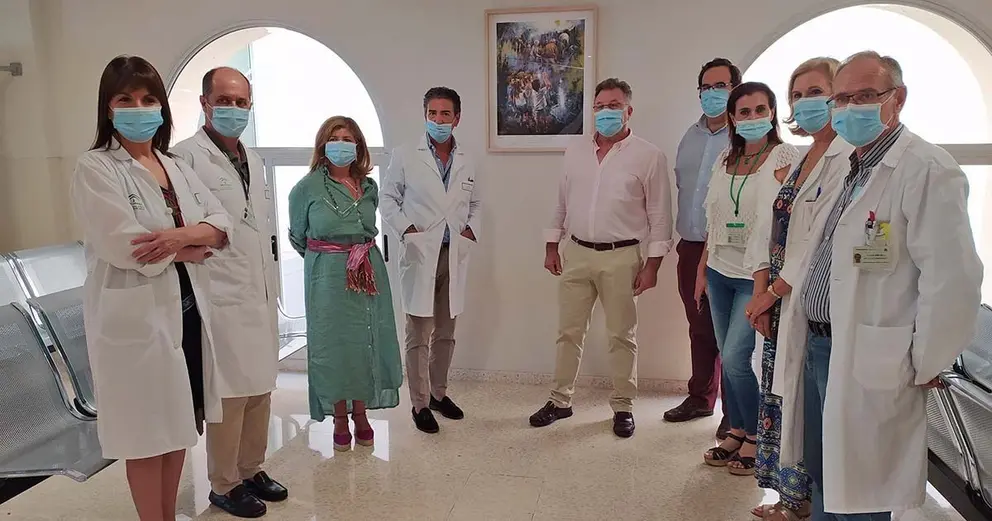 La delegada territorial de Salud y Familias, Isabel Paredes, acompañada del gerente del Área de Gestión Sanitaria de Jerez, Costa Noroeste y Sierra, Miguel Ángel Ortiz, y su equipo, así como del alcalde de La Barca, Alejandro López, han acompañado a Lucena en la donación de la primera de las 200 reproducciones que ha realizado de su obra, que desde ahora lucirá en el hall del Hospital General.