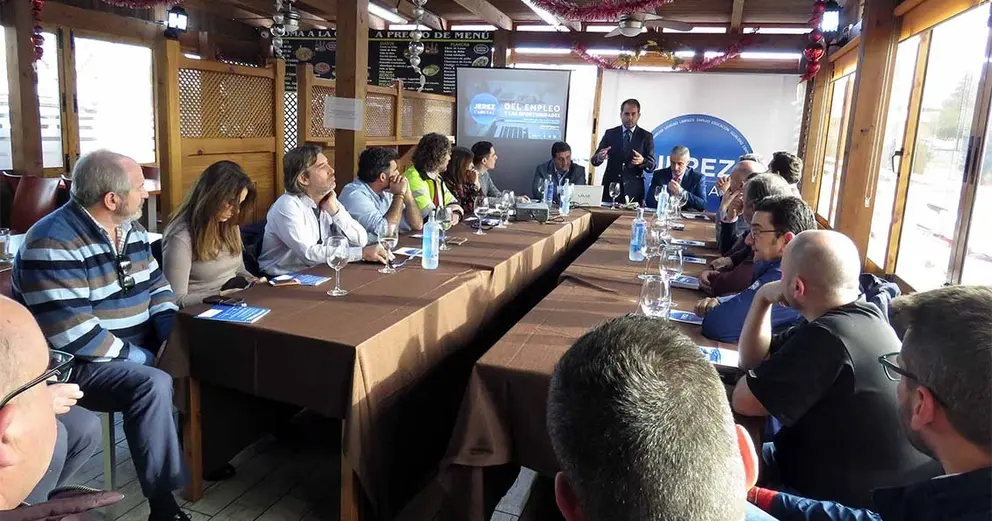 “Si Jerez es la primera ciudad en población de la provincia y la quinta de Andalucía, no podemos estar a la cabeza de España en índices de desempleo”, ha señalado Antonio Saldaña durante el encuentro mantenido con empresarios del Polígono Industrial El Portal a quienes ha presentado el área Jerez Cappital del Empleo y las Oportunidades junto a su coordinador, Ignacio Martínez.