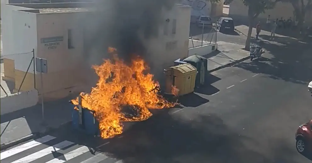 Contenedores de basura y colchones dejados en el acerado han sido prendidos fuego en plena tarde, provocando llamas de gran altura y una columna de humo que ha sido visible desde diferentes puntos de la ciudad.