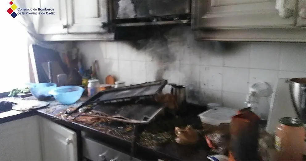 Bomberos del Parque de Jerez de la Frontera han intervenido el viernes a las 16 horas de la tarde en el incendio originado en la cocina de una vivienda de primera planta situada en la calle María del Carmen Requejo Iglesias.