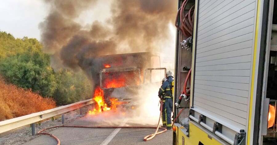 El incendio se originó en la cabina, que ha quedado totalmente destruida. Además, parte de la carga también se ha visto afectada, pero milagrosamente el conductor no ha sufrido daños.