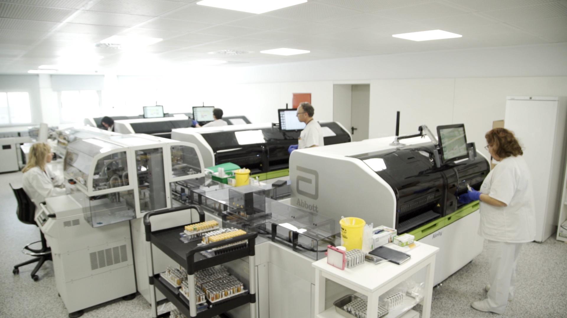El nuevo espacio cuenta con una plataforma totalmente robotizada que permite automatizar el procesamiento de la actividad de bioquímica e inmunoensayo de rutina del laboratorio, que supone unas 1.700 peticiones analíticas diarias y 20.000 resultados analíticos diarios.