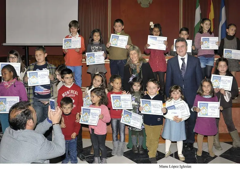 A continuación se procedió a la entrega de los premios y diplomas a ganadores y finalistas. Manuel Cordones Tomé, de 5 años de edad, del CEIP El Membrillar ha obtenido primer premio en la categoría de 2ª Ciclo de Educación Infantil; Daniel Caraballo Ortega, primer premio de la categoría de 1º,2º,3º Primaria, de 7 años de edad, del CEIP El Membrillar; Mercedes Aguilar de Rueda, el primer premio de la categoría de 4º,5º,6º de Primaria, de 11 años de edad, del CEIP Manuel de Falla. La relación de premiados continúa en la categoría del 2ª Ciclo de Educación Infantil con un 2º premio para Sara Fernández Arana, de 3 años, del Colegio Las Granjas; el 3er premio para Aitana Blanes Sánchez, de 5 años, del CEIP El Membrillar. En la categoría de 1º, 2º,3º de Primaria el 2º premio ha sido para Candela Flores Morales, de 7 años, del Colegio Manuel de Falla; y tercer premio se ha concedido a Claudia Fernández Cordón, de 6 años, del Colegio Manuel de Falla. En la categoría de 4º,5º,6º de Primaria, el 2º premio ha sido para Javier Muñoz Merlo, de 10 años de edad, del CEIP Manuel de Falla y el tercer premio se ha otorgado a Lola Montaño Ruiz, de 9 años de edad, del CEIP Las Granjas.