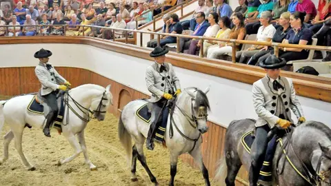 La actuación se ha iniciado con una 'Presentación' que ha llevado consigo un despliegue de 9 caballos y 10 jinetes de procedentes de Saumur; 14 caballos y 12 jinetes de la Escuela Portuguesa; 2 jinetes de la Escuela Española de Arte Ecuestre de Viena; y 8 caballos y 5 jinetes de Adrea, a los que hay que añadir los binomios de la Rea Escuela, que han realizado ejercicios de doma clásica y vaquera, así como otros trabajos de la equitación tradicional.
