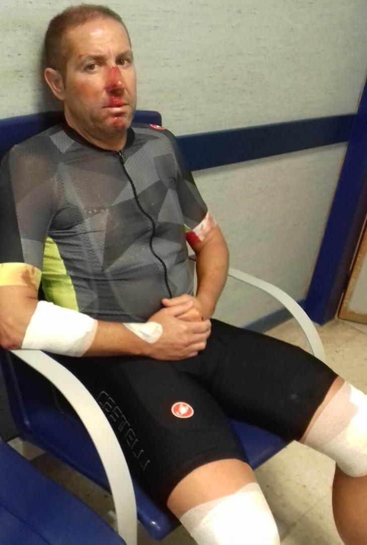 El deportista jerezano ha caído estrepitosamente contra el suelo, golpeándose el rostro con el asfalto, rompiéndose un diente y quedando movida una de las paletas, y sufriendo quemaduras tanto en la cara como en las rodillas y el codo, encontrándose muy dolorido por heridas y contusiones.
